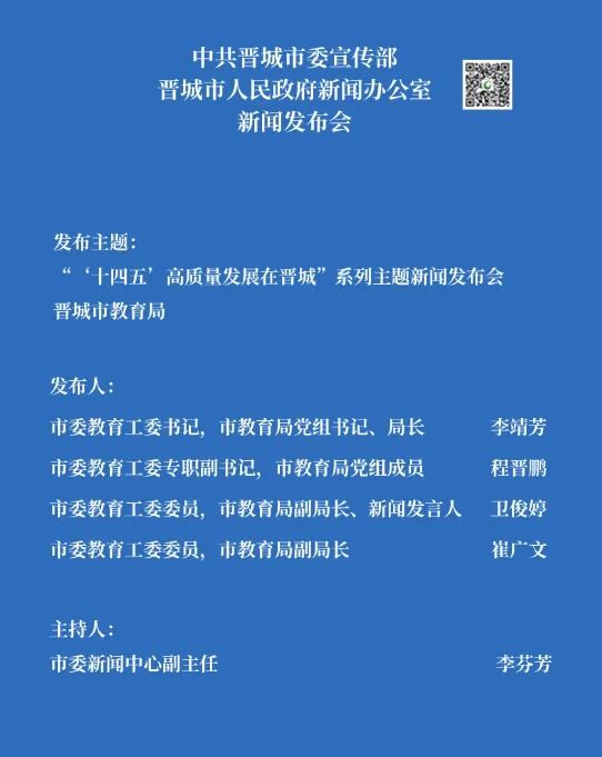大家上午好!欢迎参加由中共晋城市委宣传部、晋城市人民政府新闻办公室组织召开的“‘十四五’高质量发展在晋城”系列主题新闻发布会。我们非常高兴邀请到市委教育工委书记,市教育局党组书记、局长李靖芳,请他介绍“十四五”时期教育强市建设成效,并回答大家关心的问题。出席今天新闻发布会的还有:市委教育工委专职副书记,市教育局党组成员程晋鹏,市委教育工委委员,市教育局副局长、新闻发言人卫俊婷,市委教育工委委员,市教育局副局长崔广文。