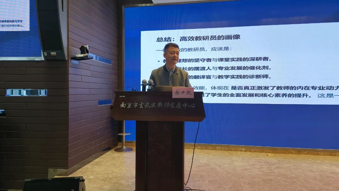 玄武区教师发展中心:余夕凯校长《新时期区域研训品质提升的路径探索》分享了打造区域性学科课堂教学模型、形成学科共识、研究《课程方案》等具体做法,并强调要激励研训员的自我成长,注重教研实效。