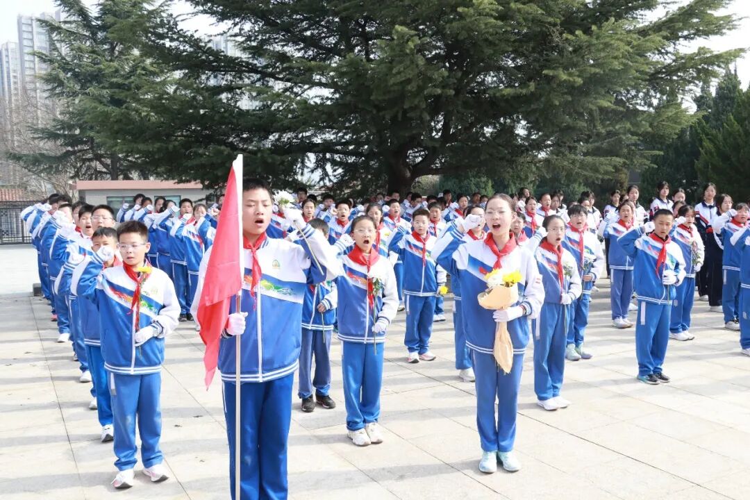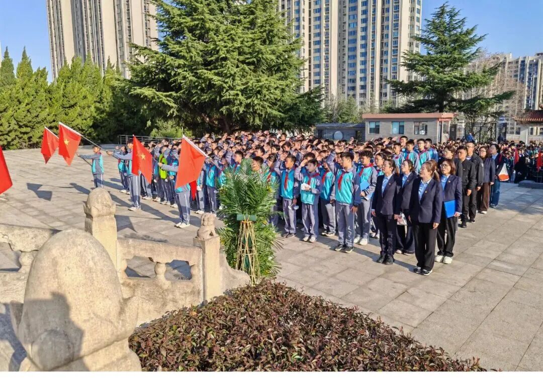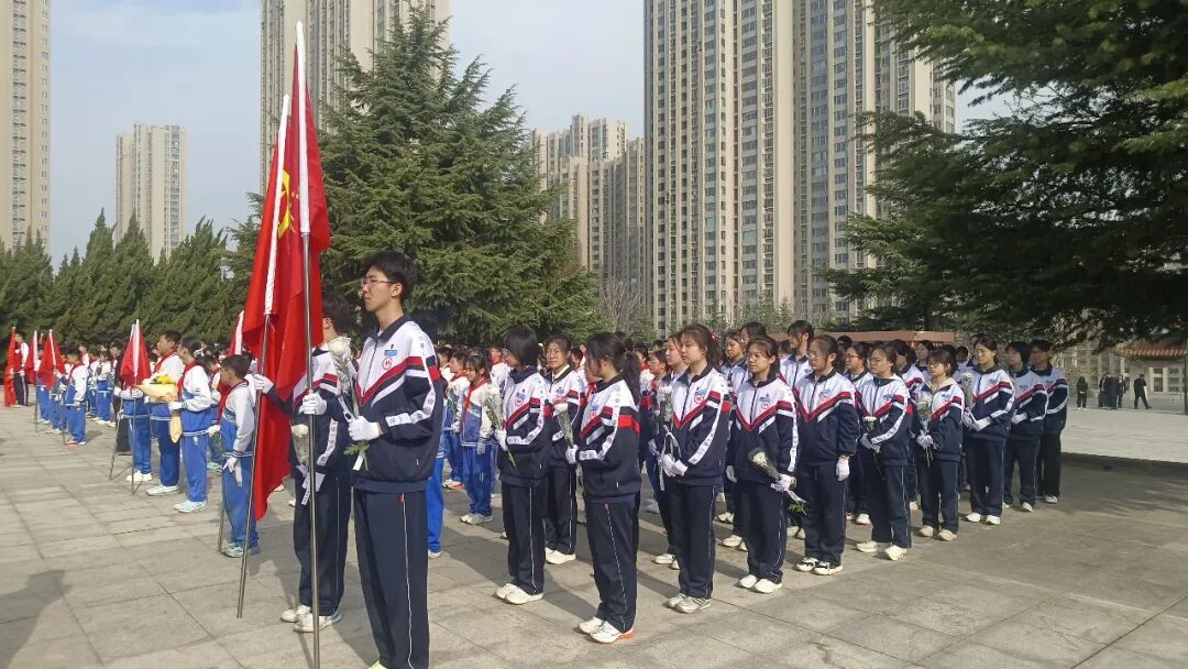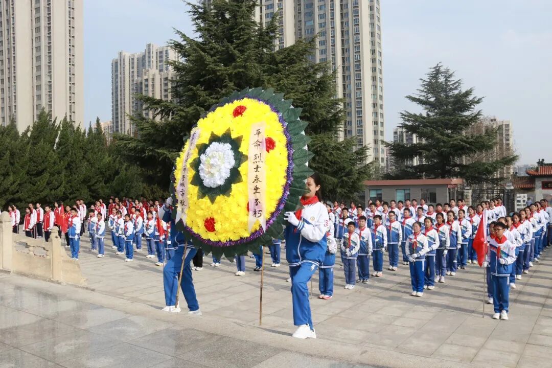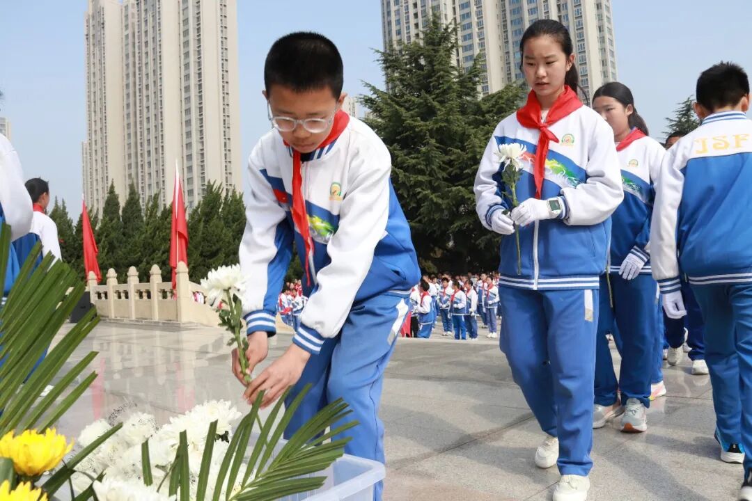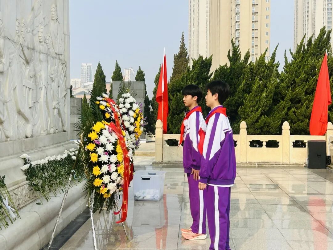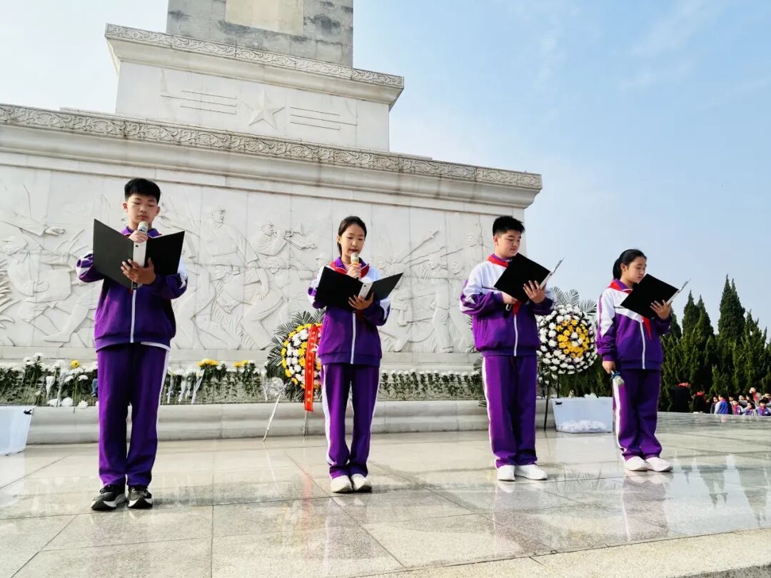 肃穆的纪念碑前,全体师生肃立敬礼,通过敬献花圈、默哀追思、朗诵抒怀、重温入队誓词等方式向革命先烈致以最崇高的敬意。郜慧琴老师向全体同学提出三点希望:铭记历史,做红色基因的传承人;勇于担当,做强国复兴的追梦人;珍惜当下,做奋斗不止的实干家。