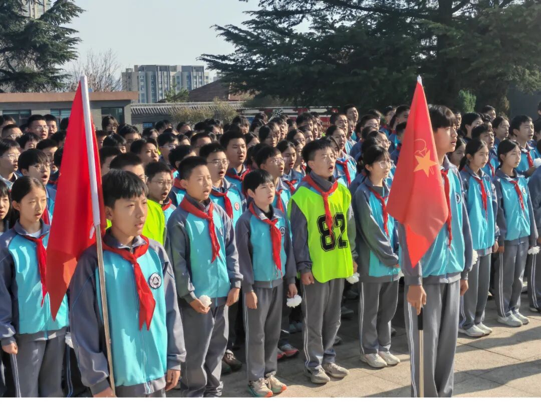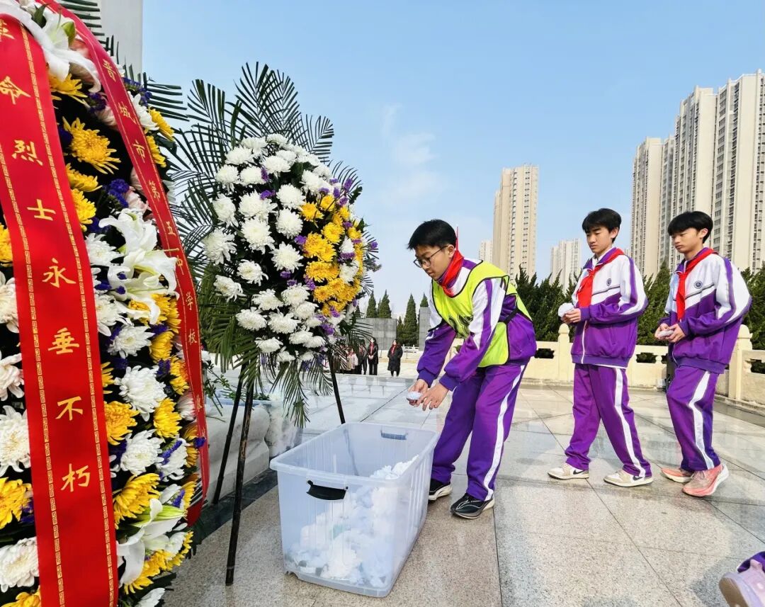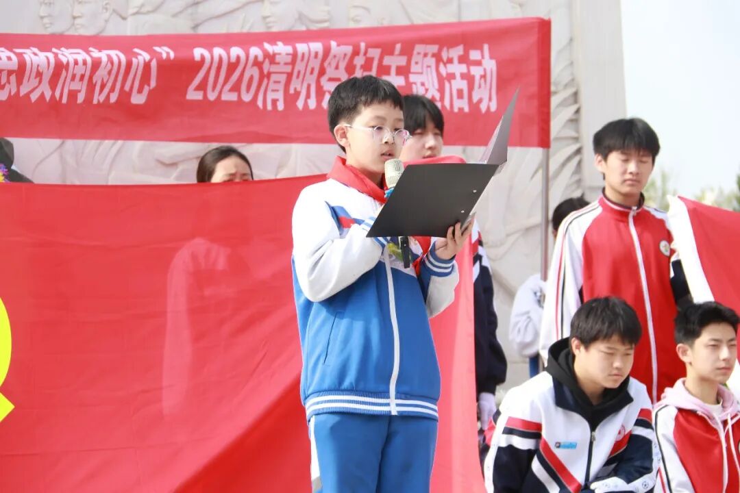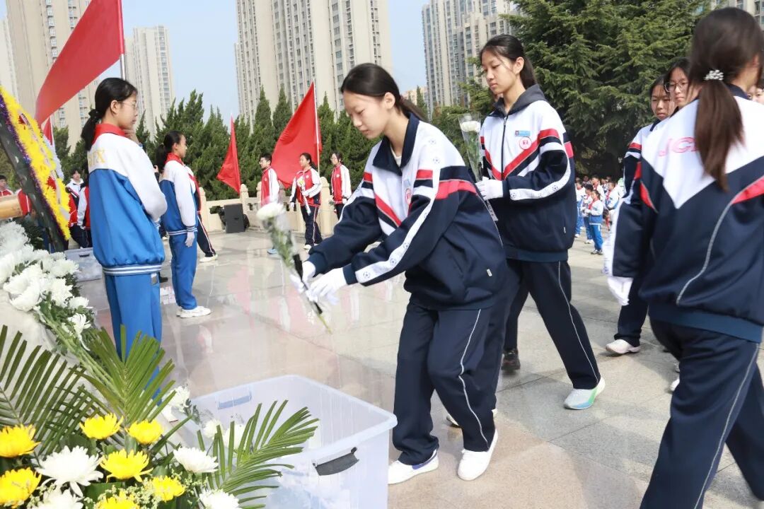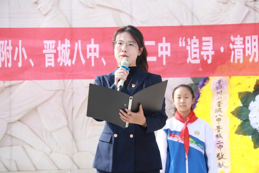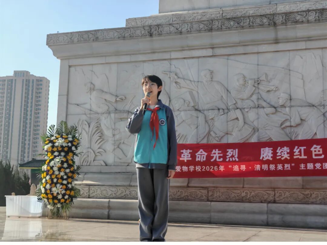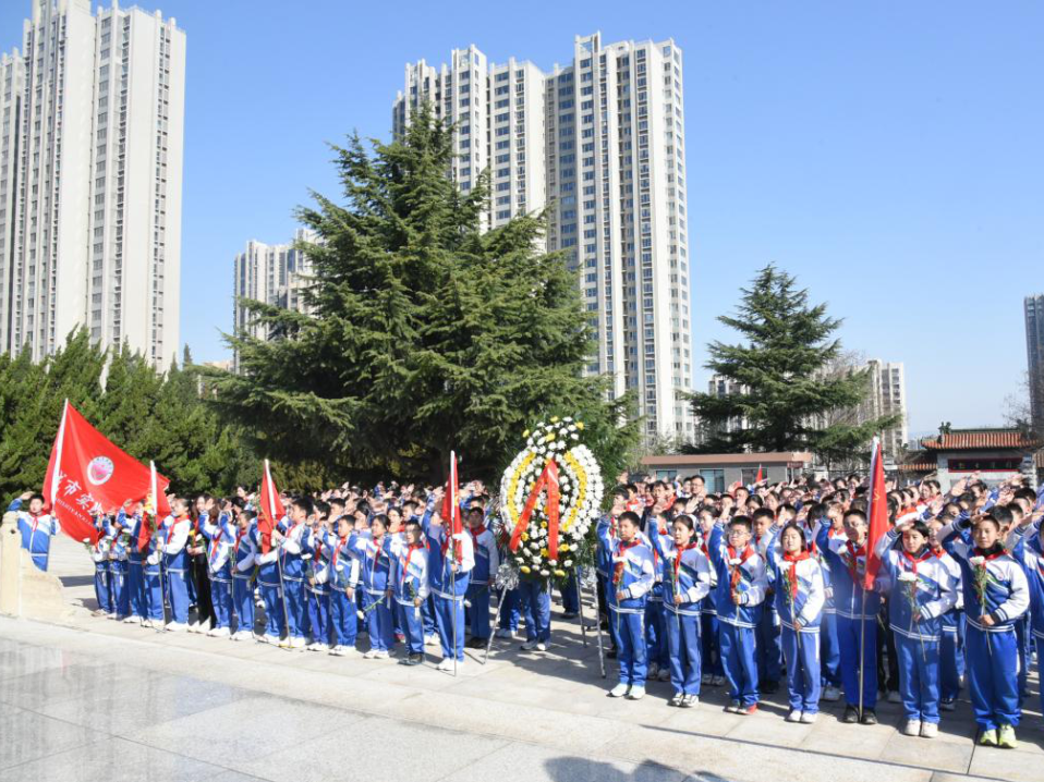 肃穆的纪念碑前,全体师生肃立敬礼,通过敬献花圈、默哀追思、朗诵抒怀、重温入队誓词等方式向革命先烈致以最崇高的敬意。郜慧琴老师向全体同学提出三点希望:铭记历史,做红色基因的传承人;勇于担当,做强国复兴的追梦人;珍惜当下,做奋斗不止的实干家。