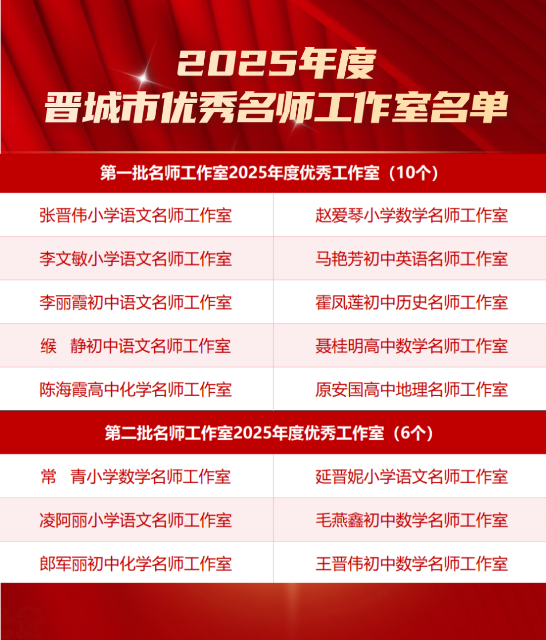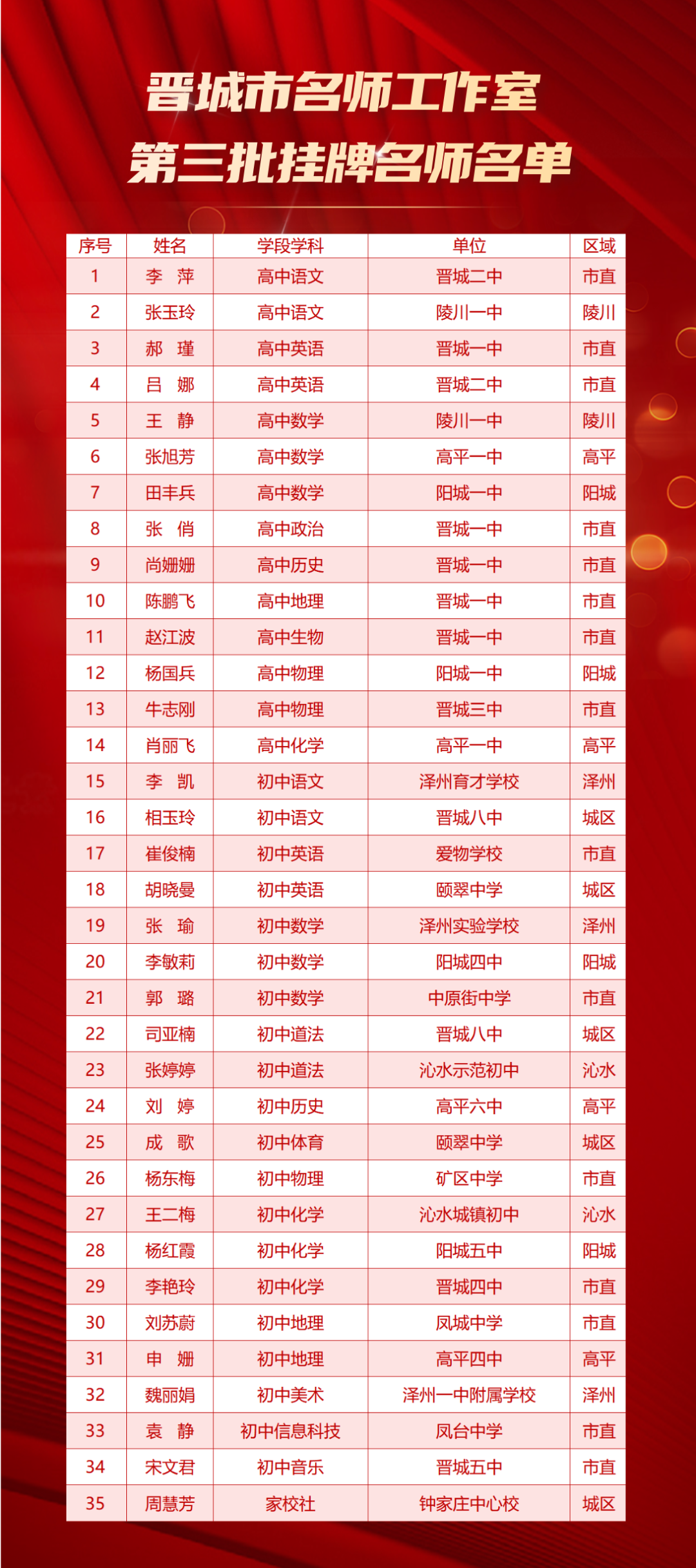各县(市、区)教育局、各学校要以名师工作室培树工程为抓手,为名师工作室建设提供坚实保障,破解运行堵点,完善激励机制,让工作室真正成为教师成长的沃土,以名师引领带动教师队伍整体提升,为晋城教育强市建设筑牢师资根基!
