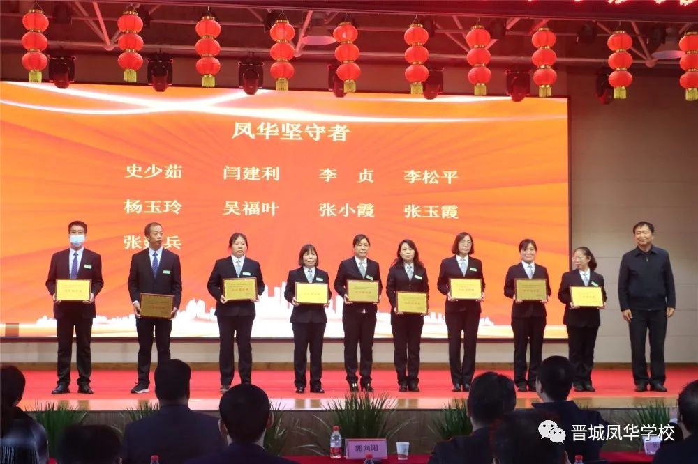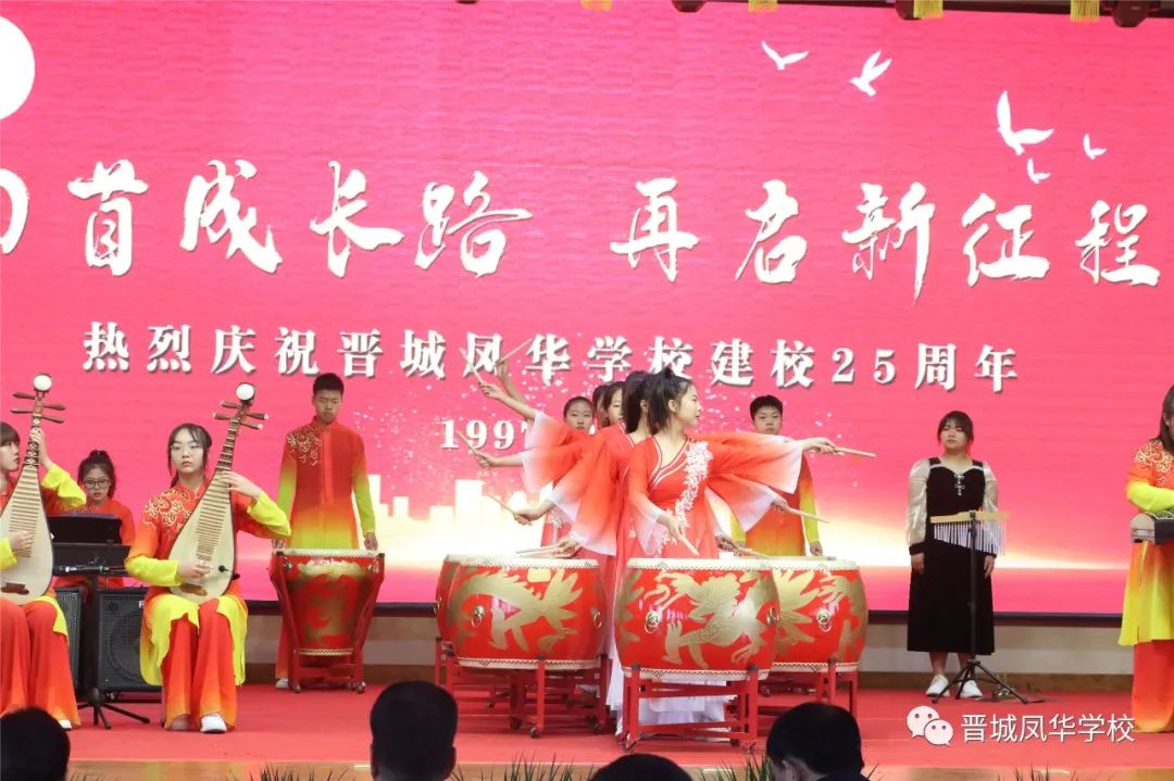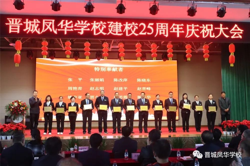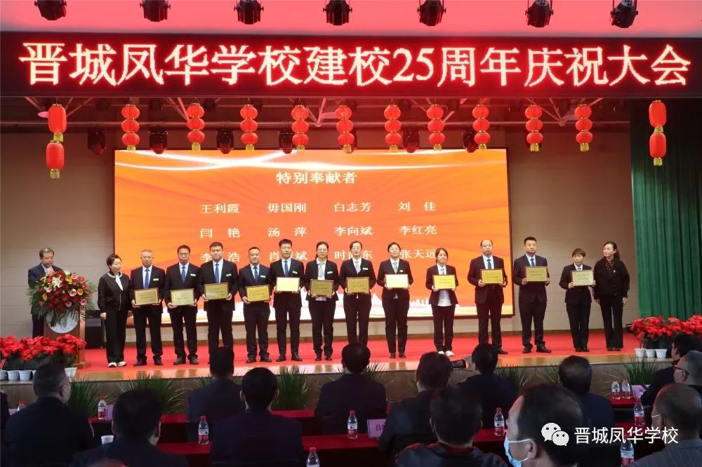 市教育局一级调研员裴家留书记,市教育局原红卫副局长,市教育局卫俊婷副局长,市教育局党组成员、招考中心主任田静妮主任为“特别奉献者”颁发牌匾。市政协副主席、民进晋城市委主委郭向阳主席为“凤华坚守者”颁发牌匾。大会在学生们表演的舞蹈《向未来出发》中落下帷幕。大会开始前,与会嘉宾还观看了校庆宣传片和民乐合奏《吉祥天鼓》。凤华廿五载岁月如歌,英才千千万桃李芬芳。晋城凤华学校将以此次校庆为契机,认真贯彻落实党的教育方针,继续发扬学校多年积淀形成的优良传统,紧跟时代步伐,为晋城民办教育事业发展作出新的更大贡献。