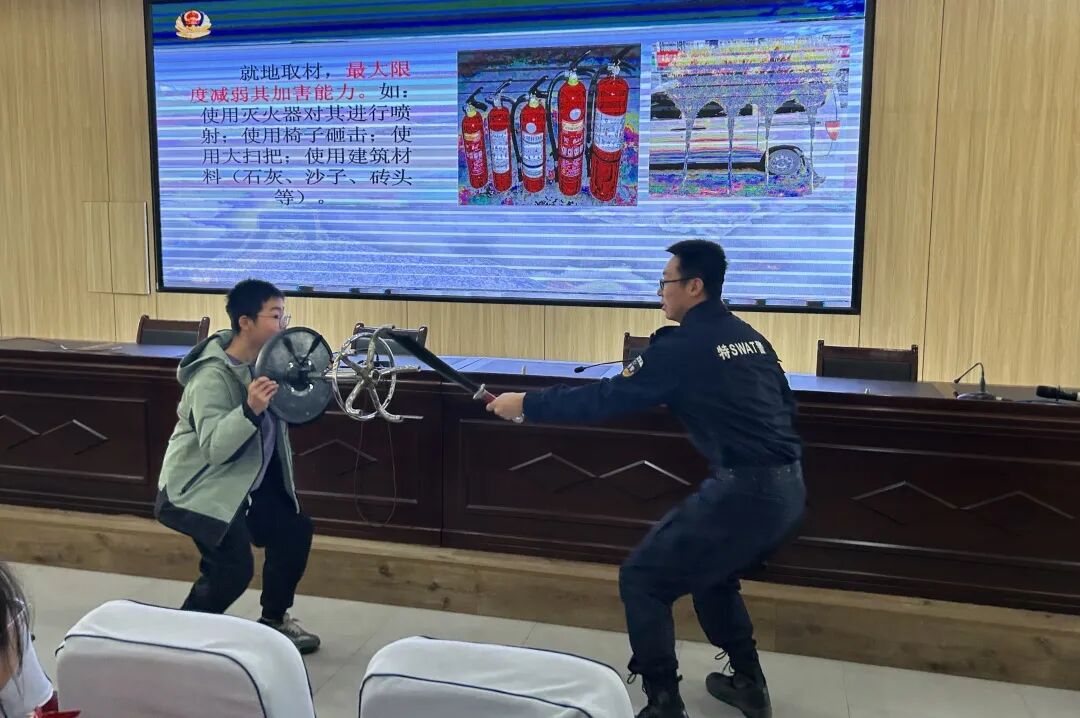 高警官的讲解生动而有趣。他强调,面对非法分子闯入校园,首先要保持冷静,迅速逃离危险区域,并拨打110报警。如果无法逃离,要寻找坚固的掩体躲避,学会利用身边的物品进行有效防护。同学们在模拟演练中,学习了如何防范和应对校园暴恐事件,增强了学生的自我保护的意识和自救技能。