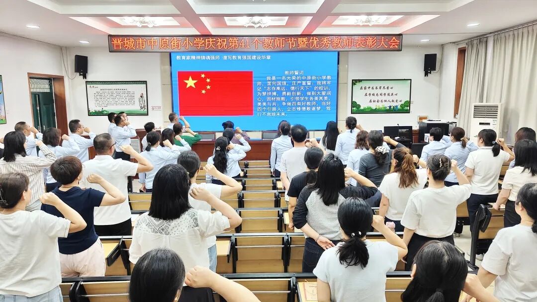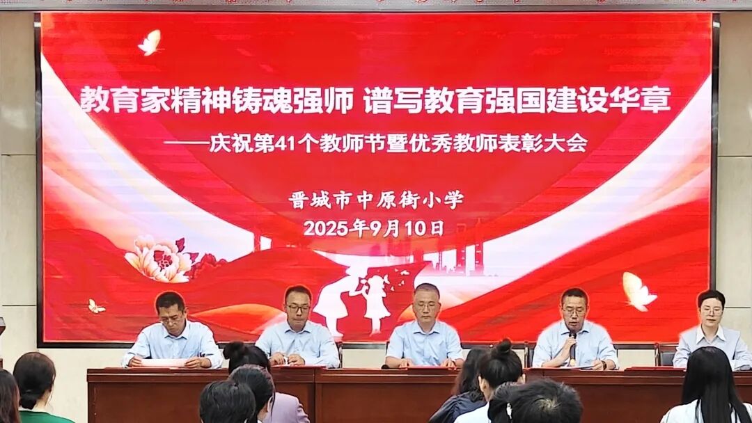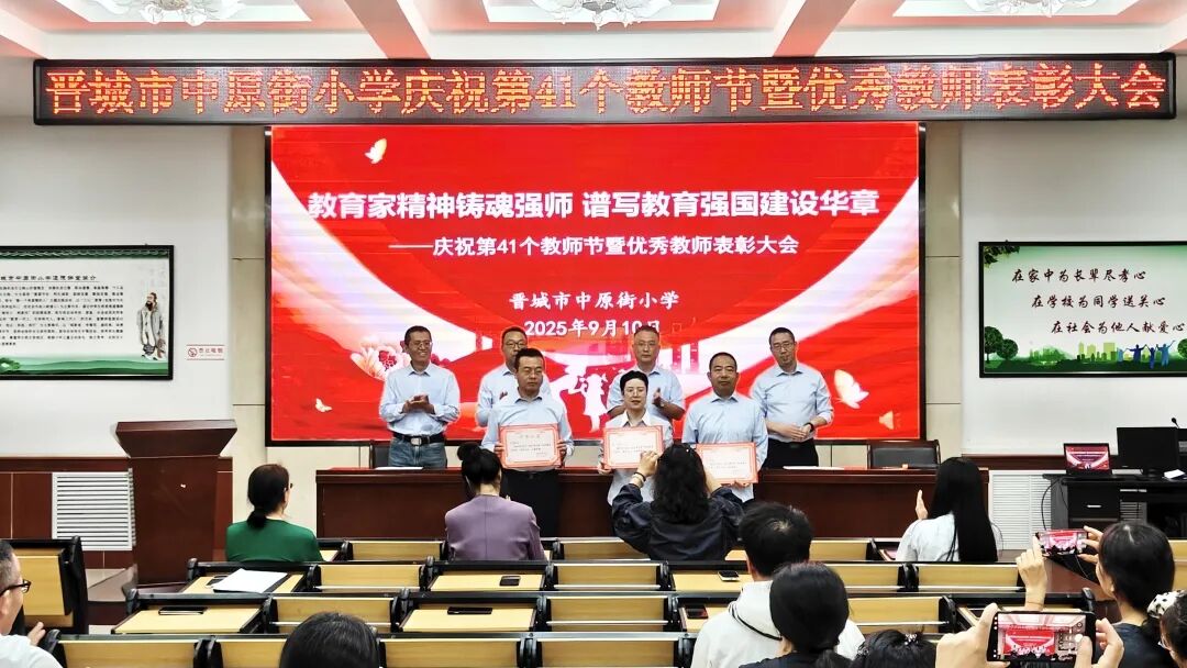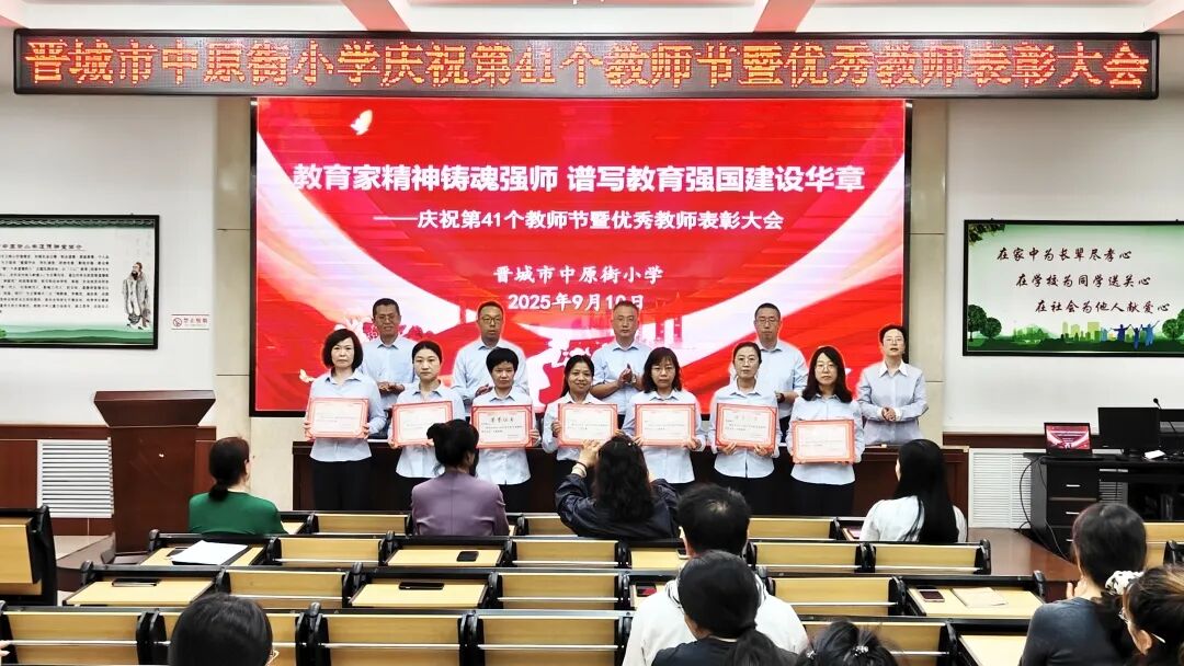 为弘扬尊师重教文化,营造浓厚节日氛围。2025年9月10日上午,全校教职工欢聚一堂,围绕“以教育家精神铸魂强师,谱写教育强国建设华章”主题,隆重举行了晋城市中原街小学庆祝第41个教师节表彰大会暨集体生日会。