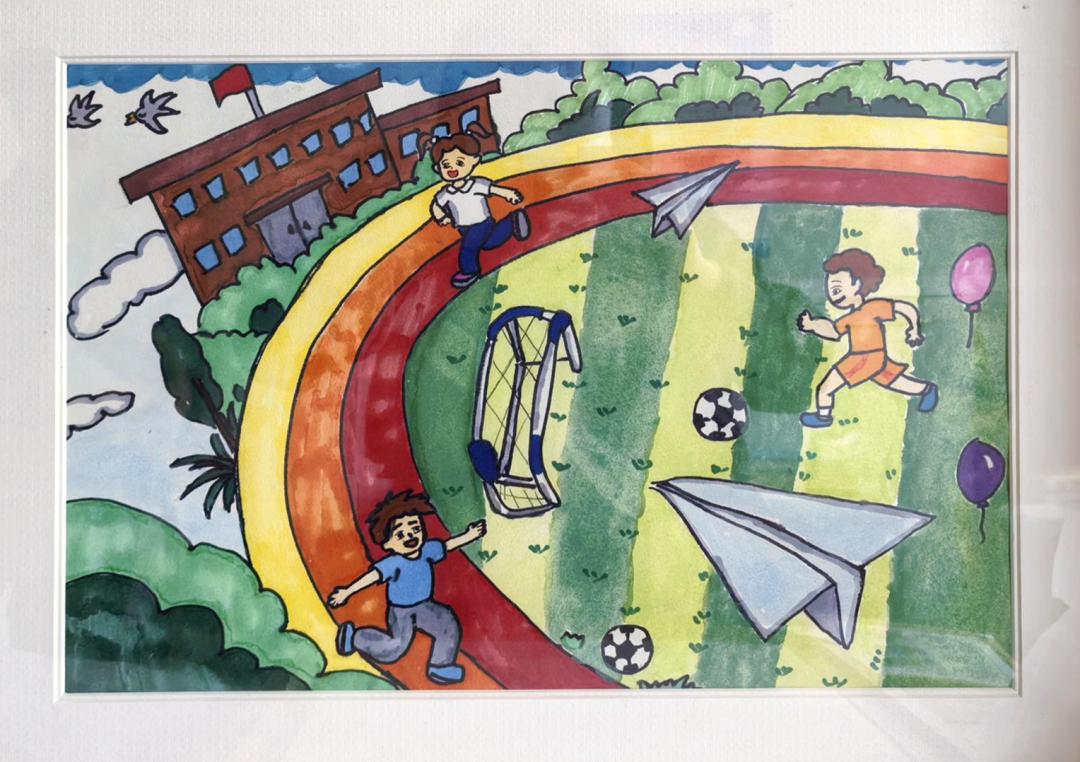作品简介:这幅画内容展现的是校园中的大课间活动,同学们在操场上奔跑、嬉戏、踢球等。校园是我们梦想的起点,在这里我们不仅学到了知识还收获了快乐和友谊。