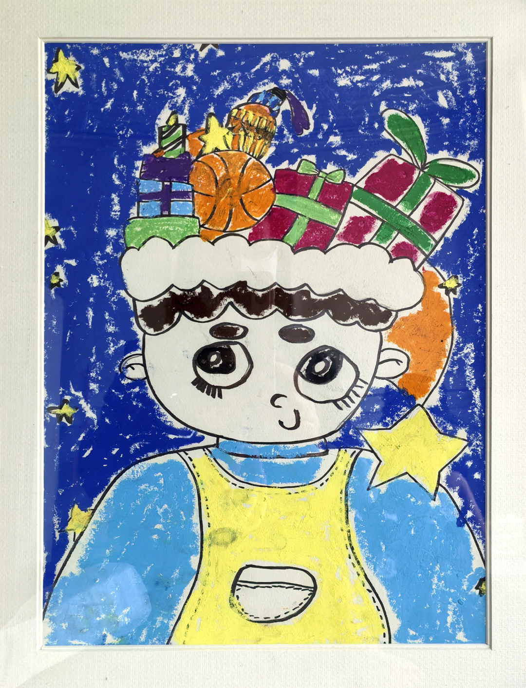 作品简介:昨天晚上我做了一个梦,梦到我拥有了很多礼物,有我最喜欢的篮球、最爱吃的饼干等,他们都在漂亮的礼物盒里,我把它们都画在了我的画纸上。
