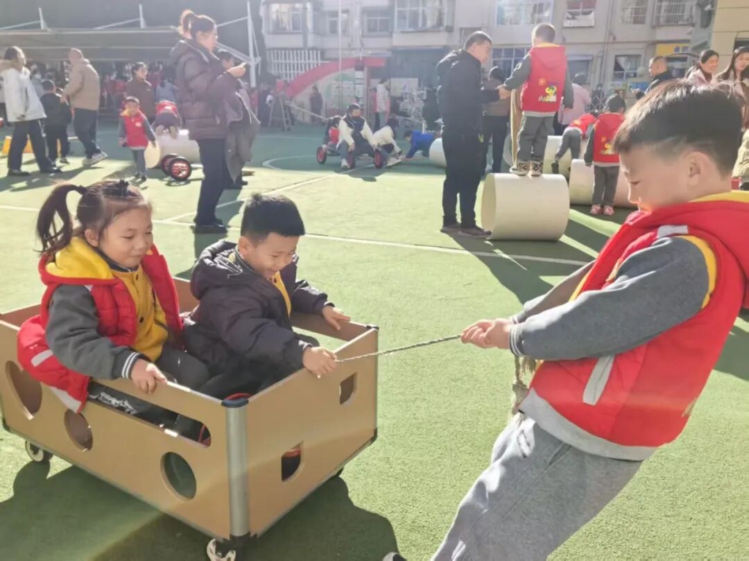 “拉小车”游戏更是热闹非凡,“你来坐车我来拉!” 的邀约声刚落,“乘客” 便化身卖力的“车夫”,你来我往间满是温情。在这里,“我们一起玩吧!”“你这个搭得真好!”简单的话语成为友谊的开端;看到小伙伴爬不上器械,主动伸出的小手、默默递来的玩具,让互助与包容在游戏中自然生长。最动人的莫过于“大带小” 的互动场景:大班孩子牵起弟弟妹妹的手,耐心协助他们跨越障碍,眼神里的责任感令人惊叹,这正是生命影响生命的生动实践。