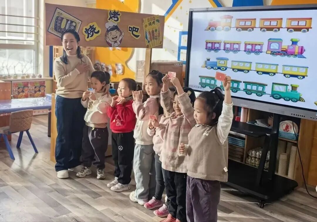 教育活动环节,老师们凭借专业的教育智慧,将枯燥的知识转化为充满童趣的探索之旅。数学活动上,10以内的序数变成了“小动物排队上车”的游戏:“熊猫排在第2节车厢,小猪要坐它后面,是第几节呀?” 举着卡片的小朋友眼睛发亮,连平时害羞内向的宝贝都高高举起了小手。原来数学不是抽象的数字,而是能让孩子追着问 “下一个小动物要去哪” 的快乐挑战。