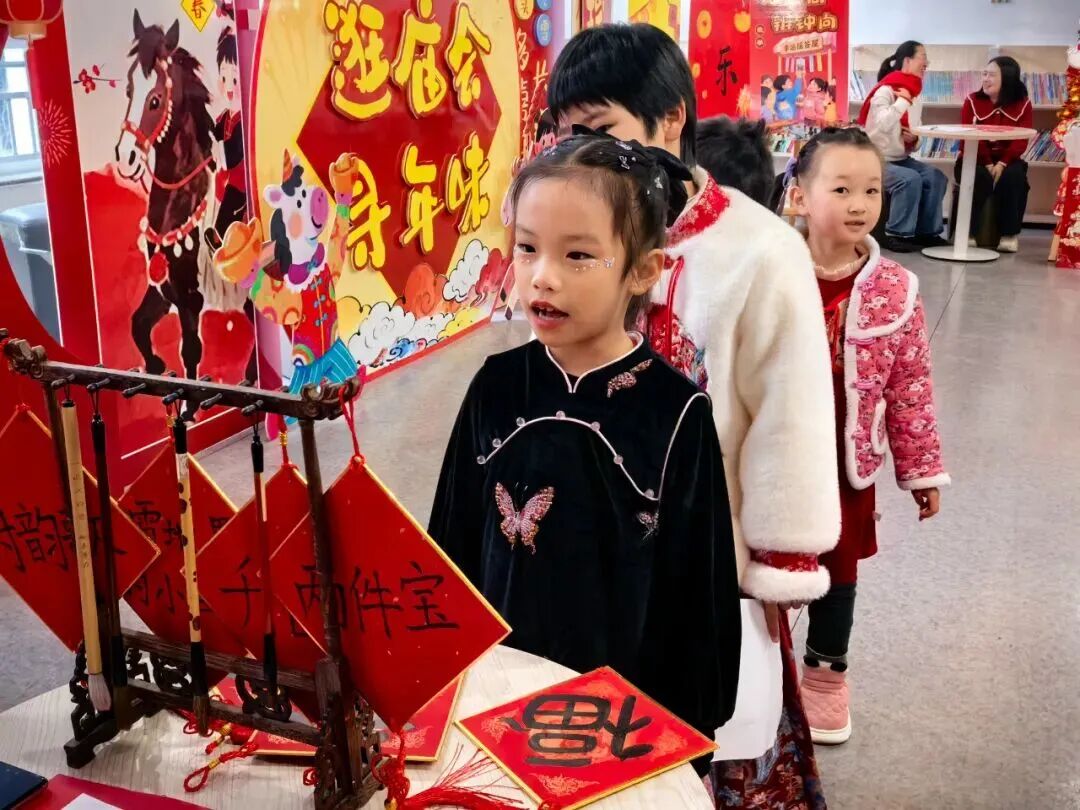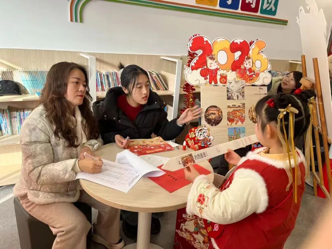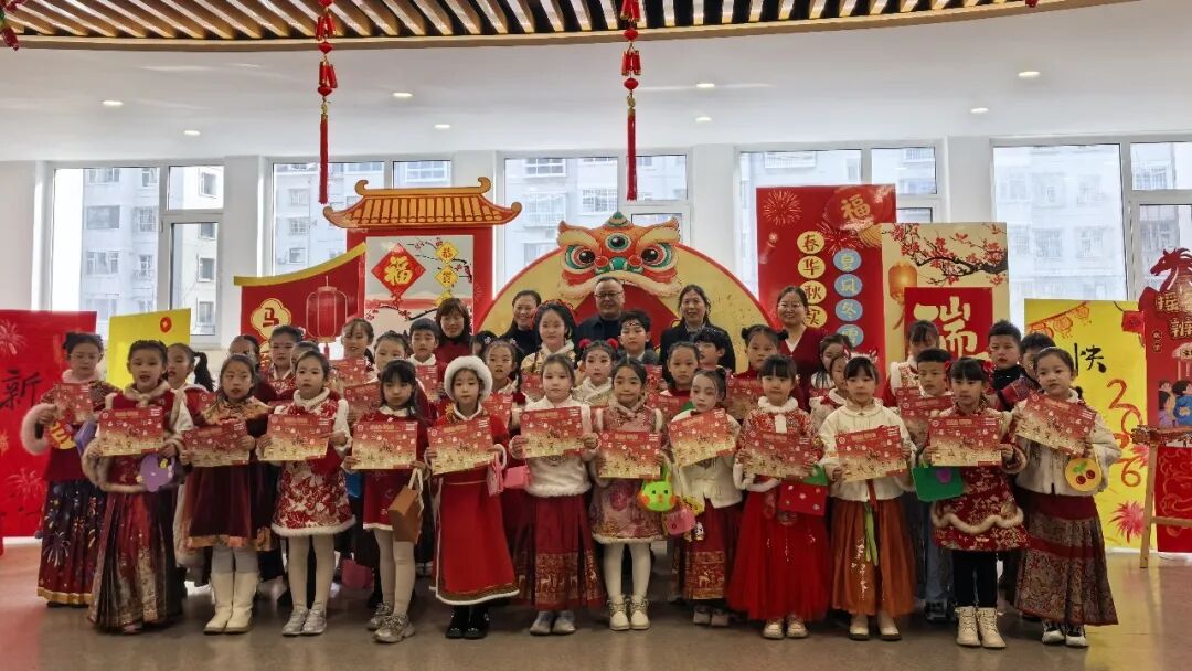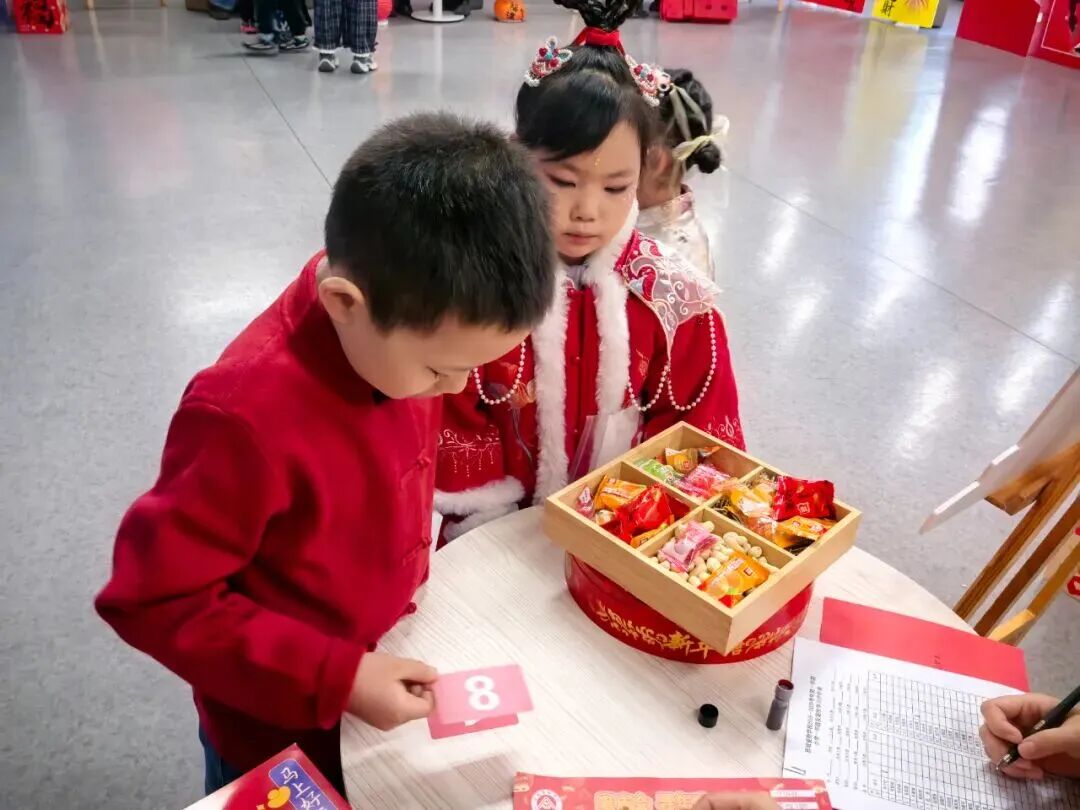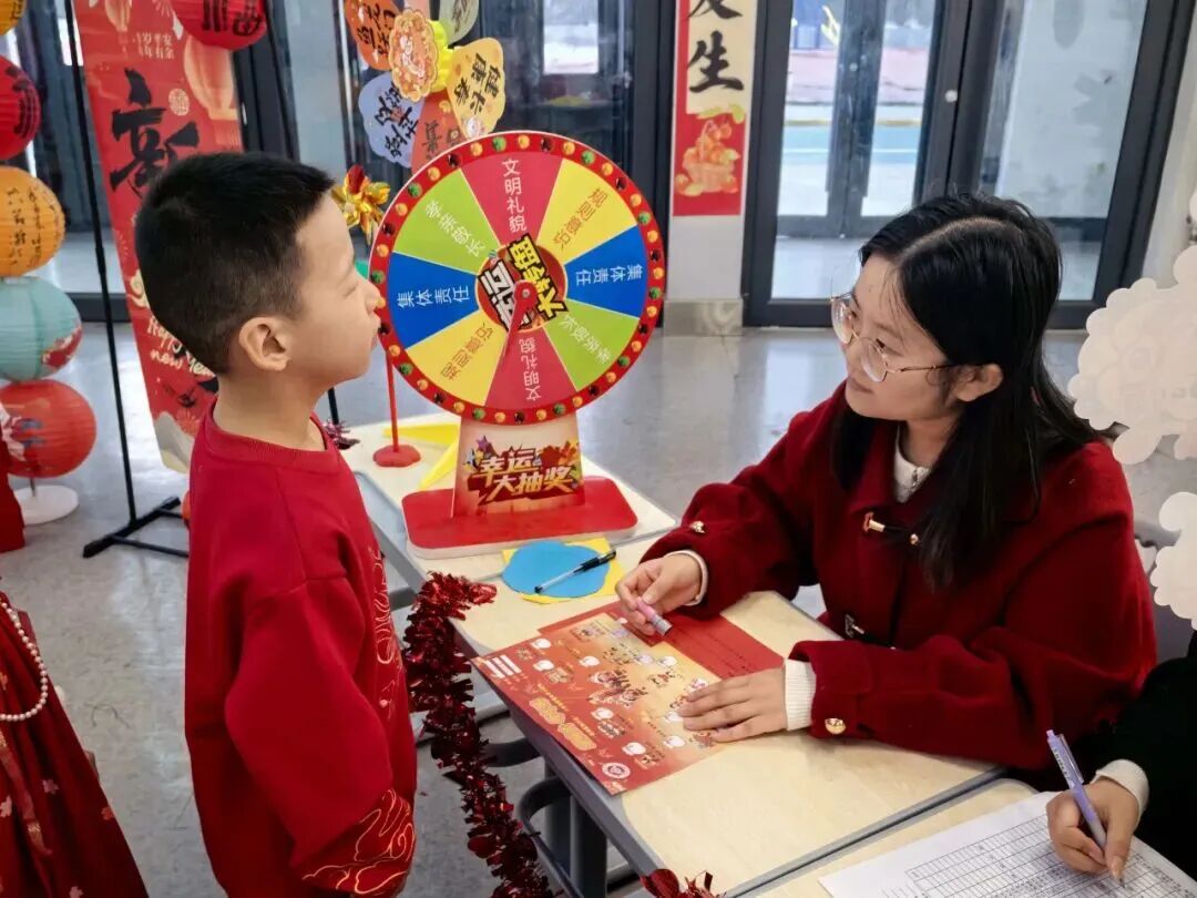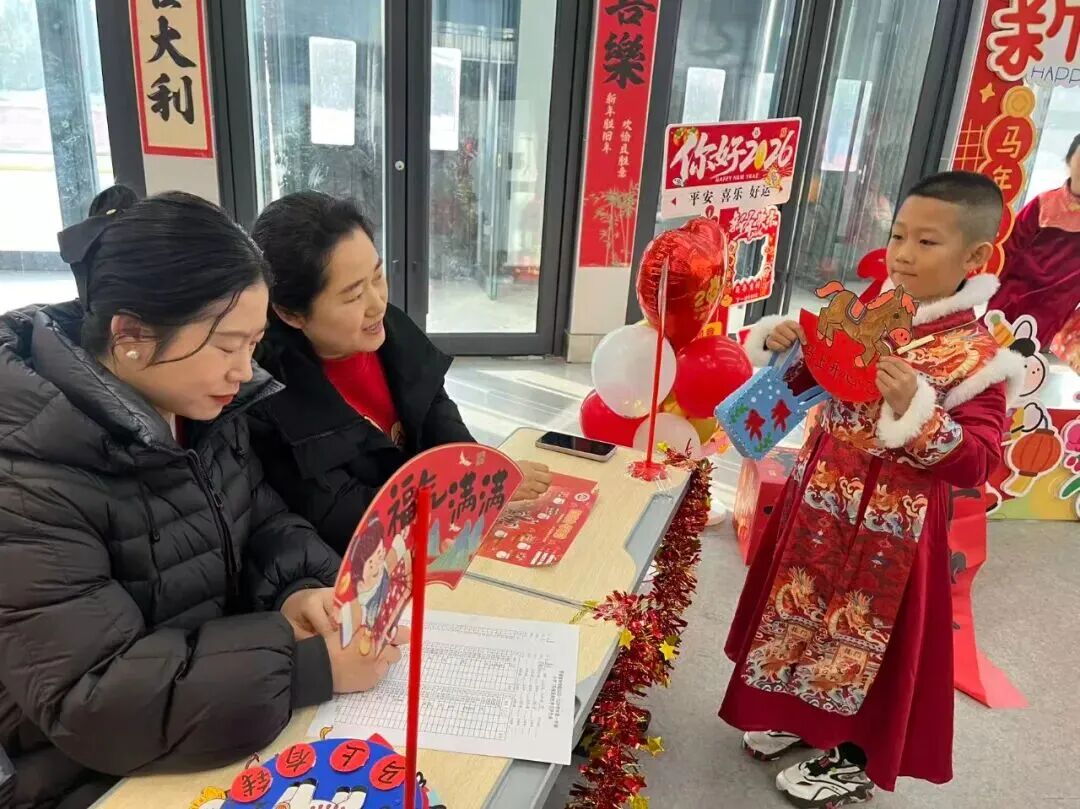 “请你背诵一句关于新年的古诗,再送上一句新春祝福吧!”在“童语迎春·诗文话年”关卡前,红纸铺展、福字点缀,语文老师们或俯身倾听,或微笑鼓励,孩子们自信地张口诵读经典诗词,稚嫩的声音里满是对新年的期盼与对传统文化的热爱。