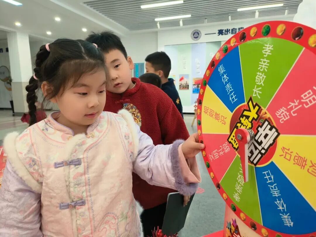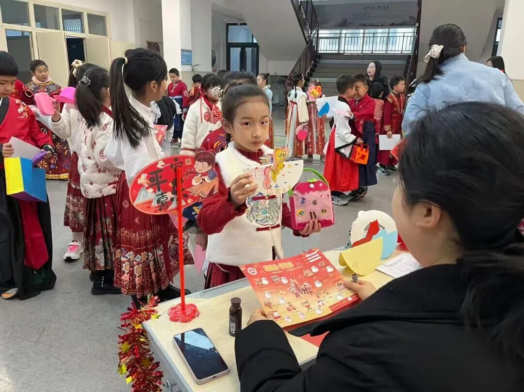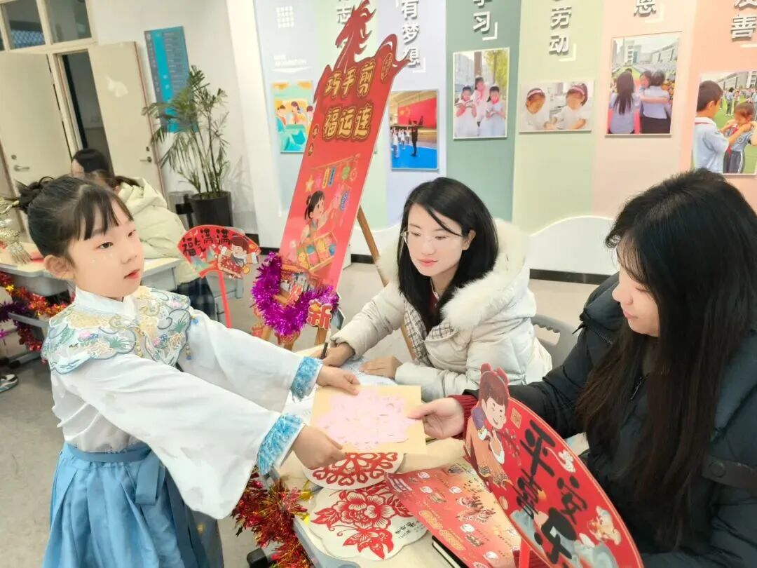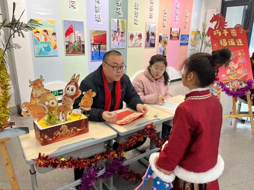 不同于传统考场的安静肃穆,校园内张灯结彩、年味十足,孩子们也穿上了喜庆的新衣,一个个充满童趣的考核关卡错落排布。“童语迎春·诗文话年”“庙会探趣·数算乾坤”“剪纸生花·童手创艺”等八大主题关卡,将语文、数学、科学、美术、音乐、体育等学科知识与传统年俗、劳动实践、品德养成巧妙融合,让“考试”变成了一场兼具知识性与趣味性的“新春庙会”。