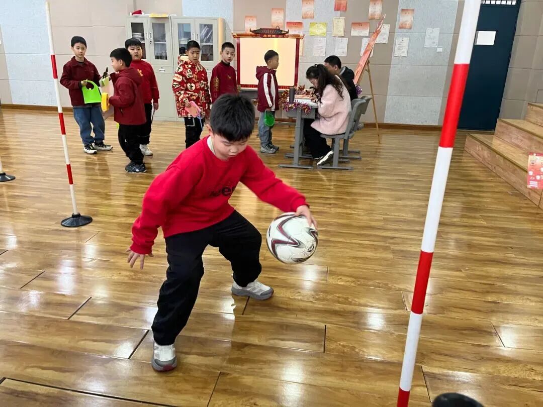 “锣鼓喧天·童音贺岁”关卡里,锣声阵阵、鼓声咚咚,孩子们分工协作、敲锣打鼓,在音乐律动中感受合作的快乐;“糖画神奇·甜蜜探秘”关卡将糖画制作与科学知识相结合,孩子们在欣赏精美糖画、品尝甜蜜滋味的同时,辨认季节特征、探究房屋结构,感受生活中蕴藏的自然规律与科学智慧。“陀螺飞扬·足下生风”关卡中,孩子们化身“神射手”,踢射足球、奋勇闯关,在奔跑跳跃中锻炼体能,展现朝气蓬勃的精神风貌。