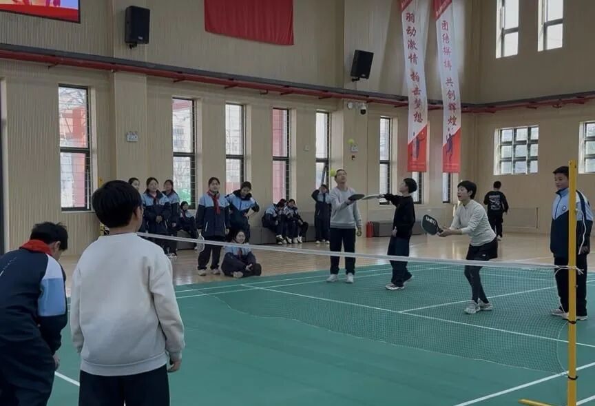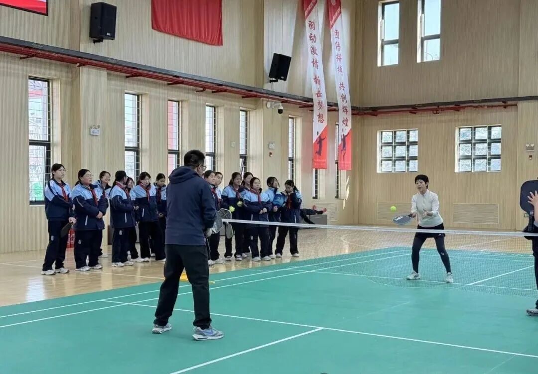 体验环节中,篮球馆内瞬间沸腾起来。学生们手持球拍,身姿灵动,从最初的生疏试探,到反复的接发球练习,再到渐入佳境的双人对打,每一次挥拍、每一次击球都充满力量。清脆的击球声、欢快的欢呼声、默契的呐喊声交织在一起,回荡在体育馆的每个角落。