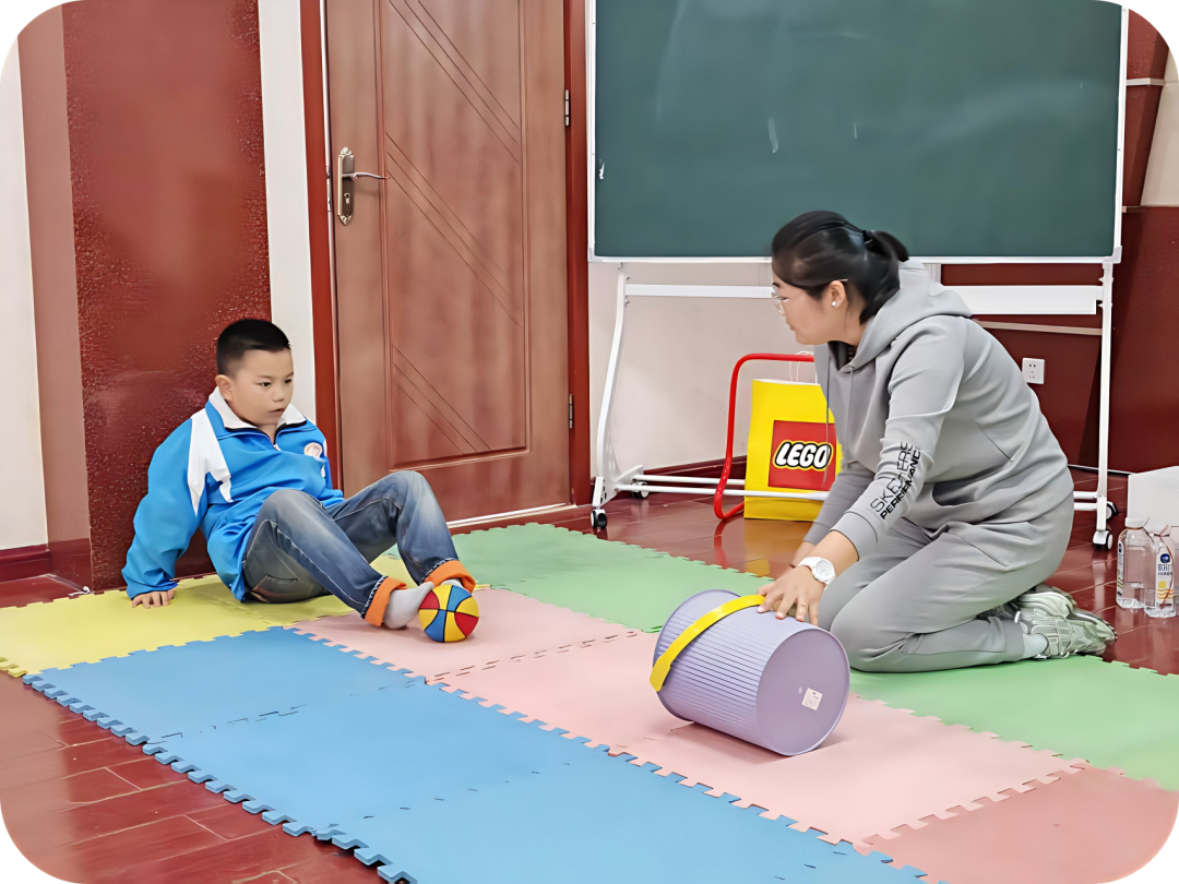 张慧茹老师以《小球的奇妙旅行》为主题,设计“趴地推球”“坐姿双脚推球”“踢小球”等趣味游戏,带领小石同学在趣味游戏中完成核心肌肉群训练、肢体协调性及平衡能力训练。