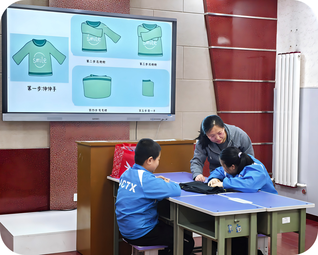张丽娟老师的《我会叠衣服》贴合学生生活实际,用趣味儿歌形式引导学生掌握折叠要领,通过示范引导、手把手辅助、口令提示等方式,让小淇同学和小洋同学在实操中收获生活技能,提升生活自理能力。