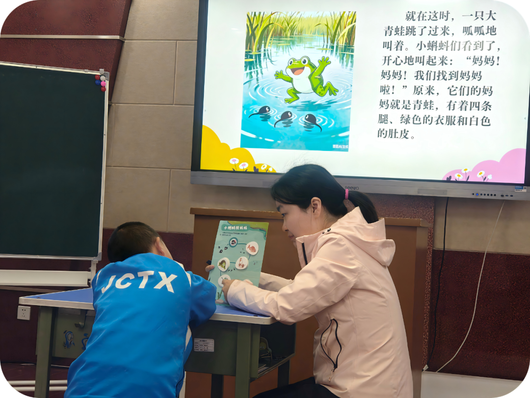 色彩鲜活、趣味满满的绘本,是打开学生言语世界的“魔法钥匙”。针对构音困难、语言发育迟缓的小泽小朋友,冯梦柯老师以绘本《小蝌蚪找妈妈》为载体,将发音矫正、语句仿说、情景对话等专业训练融入故事情境,通过跟读指读、互动问答等形式,他从最初的紧张不安,逐渐放松投入;从胆怯沉默、被动回应,慢慢变得主动表达、勇敢发声。每一点微小的进步,都是他跨越成长障碍的坚实脚步,更是生命向阳生长的最美模样。