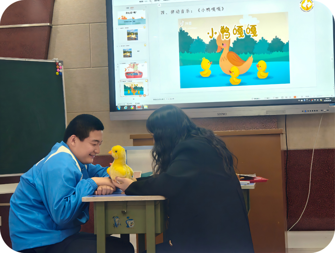 刘美芳老师运用多感官刺激教学法,将训练目标细化拆分,遵循“小步子、多循环”原则,以认识“鸭子”及其特征为载体,助力小恒同学在认知上建立事物与名称的对应关系,突破发音难点。专注力、配合度也有所提升。