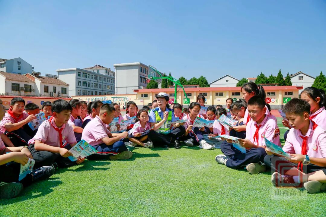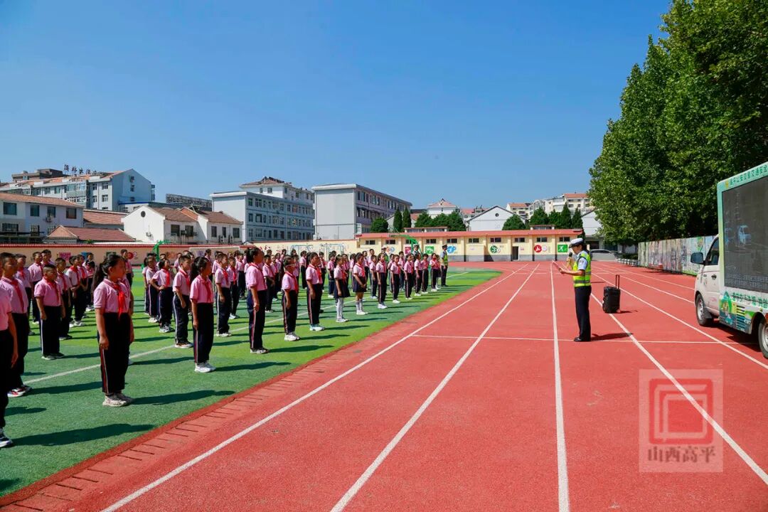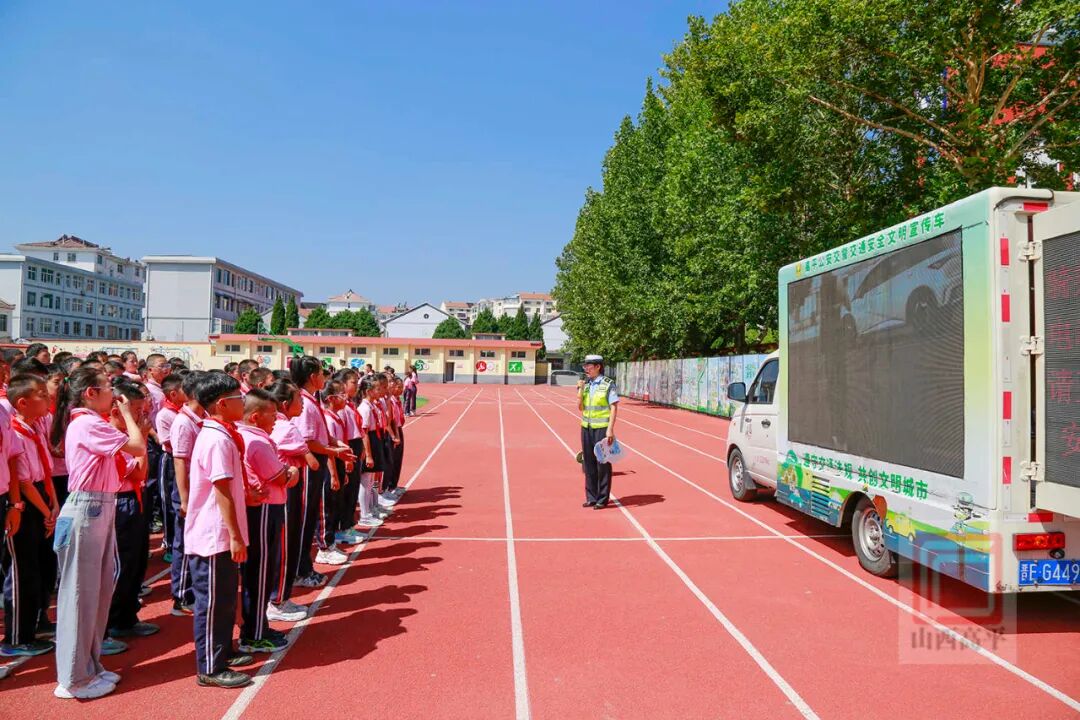 操场上,宣传民警通过“案例讲解+警示教育片+宣传资料”相结合的形式,用通俗易懂的语言,向学生们详细讲解交通标志识别、步行安全规范、骑行防护要点、乘车安全准则及“一盔一带”等交通安全知识,引导学生们养成自觉遵守交通法规的好习惯,安全文明出行。