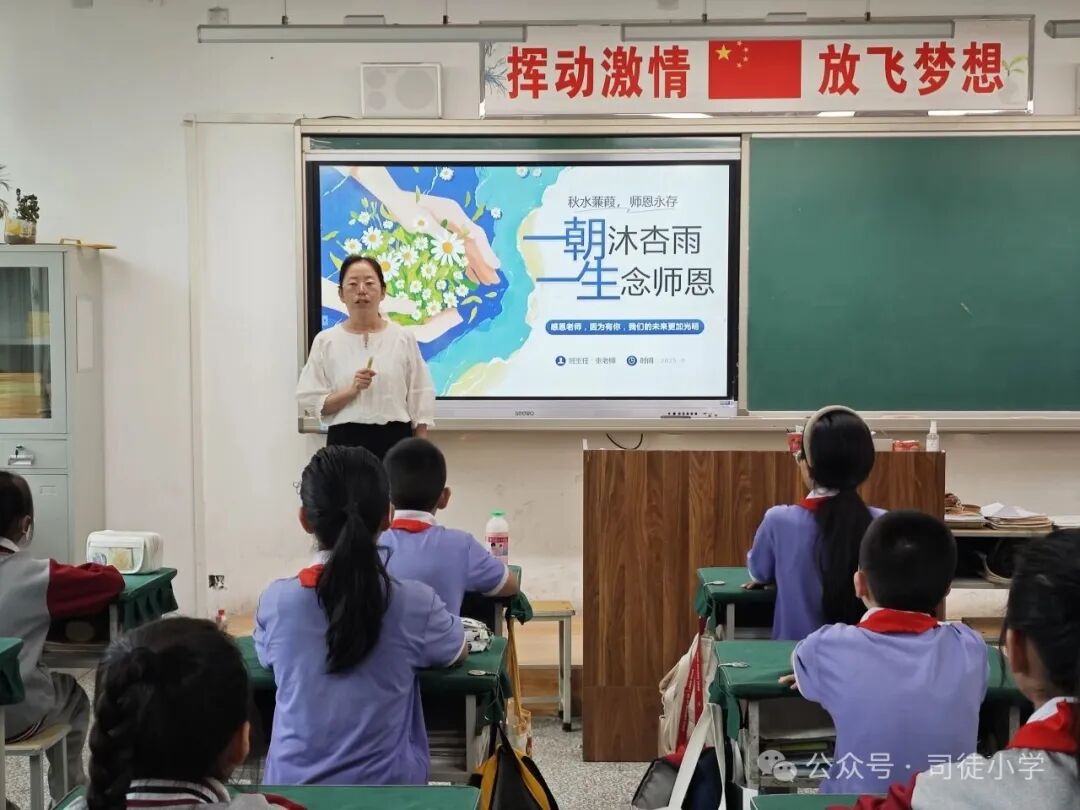 上课前,各班班长带领全班同学起立,向老师齐声问候:“老师,您辛苦了,祝您节日快乐!” 一声问候,一份真情。在美术课上,老师们耐心指导,学生们亲手制作了一张张精美的教师节贺卡。孩子们用画笔和巧手,为老师准备了独一无二的节日礼物。各班还召开了主题班会。老师们通过生动的课件,向同学们讲述教师节的由来,传递尊师重教的传统美德,在孩子们心中播下感恩的种子。