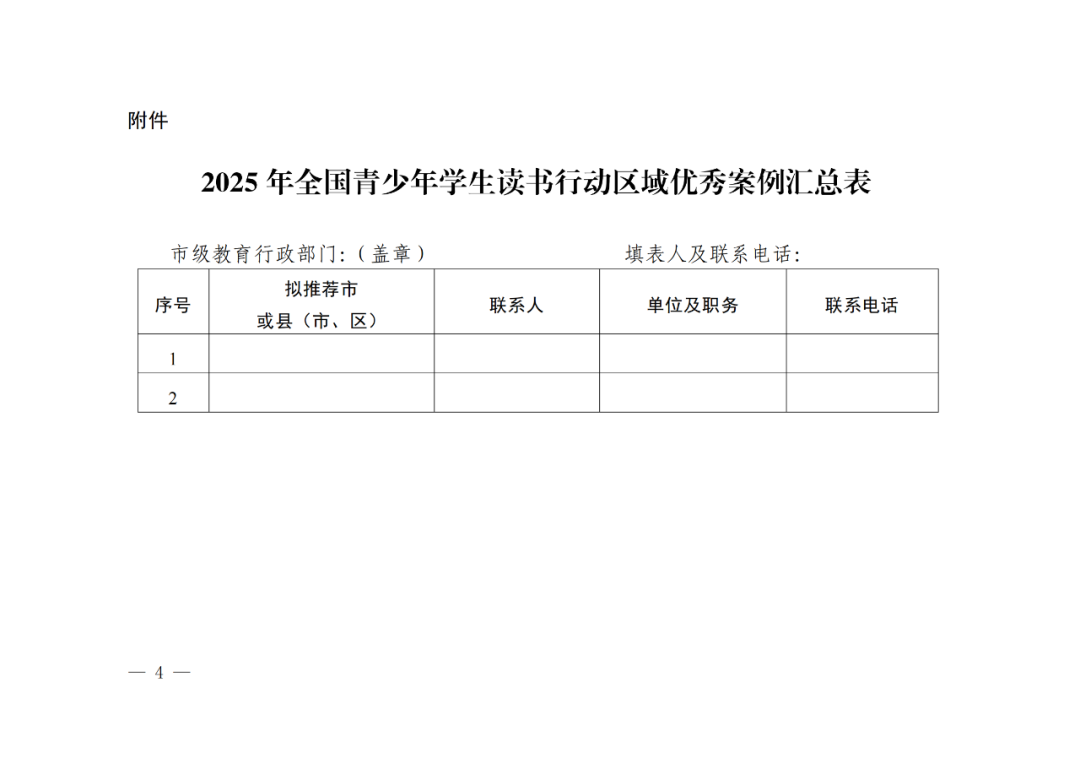 (三)按时报送材料。案例应突出经验、亮点、成效等内容,篇幅不超过3000字。于11月25日前将加盖公章的《2025年全国青少年学生读书行动区域优秀案例汇总表》(见附件)扫描件、文档电子版及推荐材料电子版发送至联系邮箱。